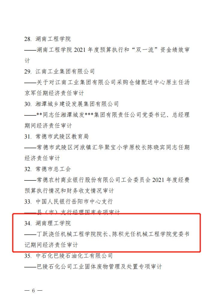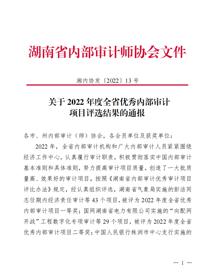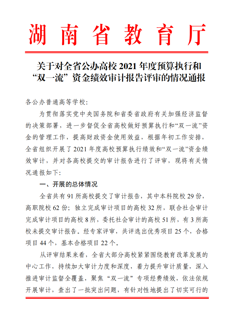 12月9日,湖南省教育厅下发《关于对全省公办高校 2021 年度预算执行和“双一流”资金绩效审计报告评审的情况通报》,我校自主独立审计、报送的《sunbet申搏2021年度预算执行和“双一流”资金绩效审计项目》获评优秀项目,评分为优秀审计项目单位第四名,前三名均为委托社会中介机构实施审计项目的高校。另外,在2022 年度全省优秀内部审计项目评选中,我校--经济责任审计项目获全省优秀内部审计项目一等奖。